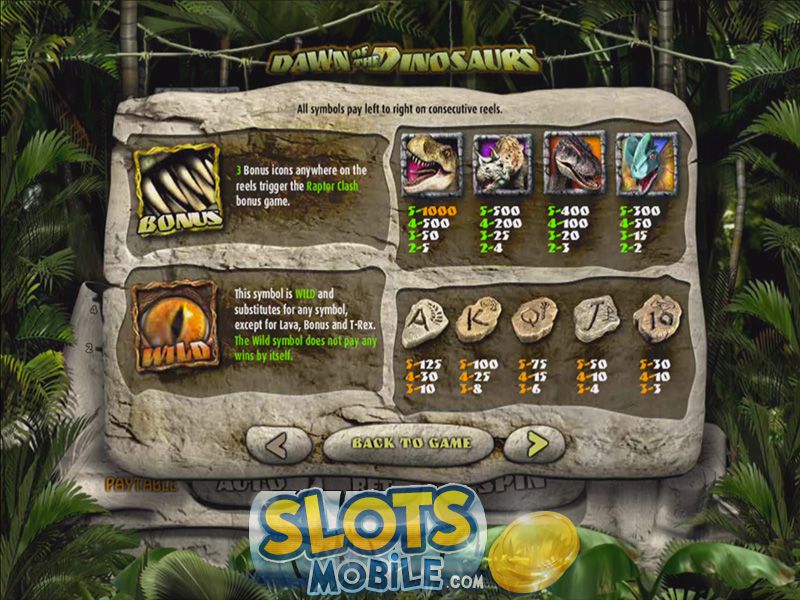 Chances are you will be impressed by the number of bonus rounds when playing Dawn of the Dinosaurs on your handheld device, seeing as how these include Raptor Clash Bonus, Free Spin Explosion and Combo Completer, awarding free spins, multipliers and instant credits.
