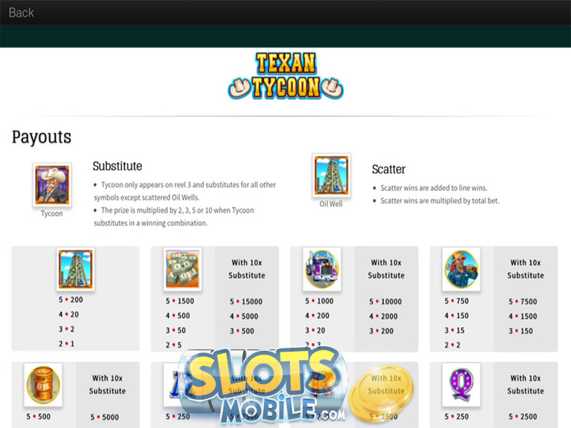 Spin or Auto Play starts the game, whereas you can also tap Speed to choose the rate at which the game will be played. Tap Settings and then Help to access the Paytable. Make sure to spend some time studying game rules, payouts and special features before playing Texan Tycoon for the first time since this way you can develop the right strategy.